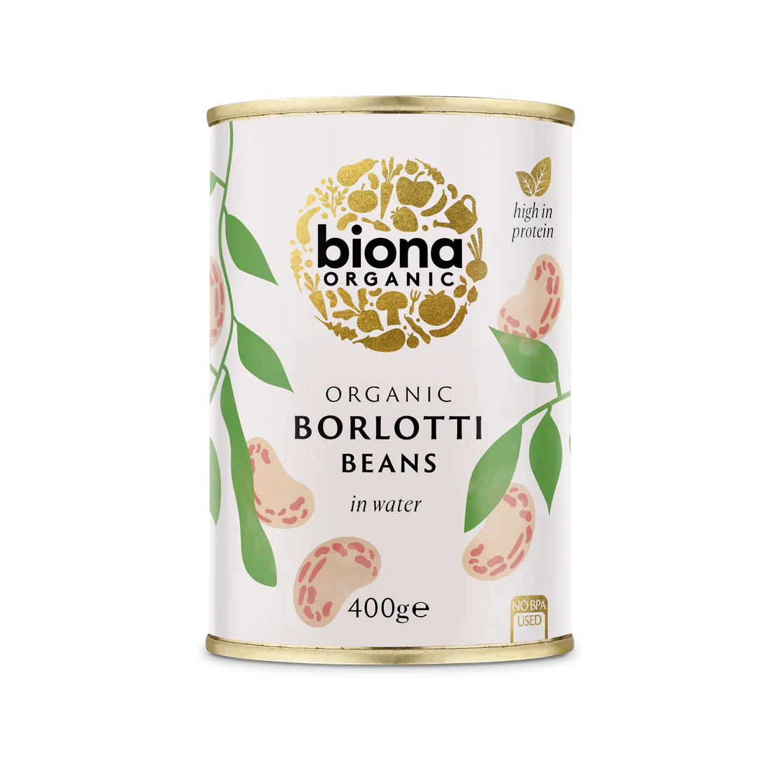 Fasole borlotti, de la Biona Organic. Doar apă și fasole certificată organic, nimic altceva, fără zahăr sau sare adăugată. Un soi versatil cu o textură cremoasa și o notă ușoară de nuci, bogate în proteină vegană, fibră și potasiu. Ambalat în conservă fără BPA.