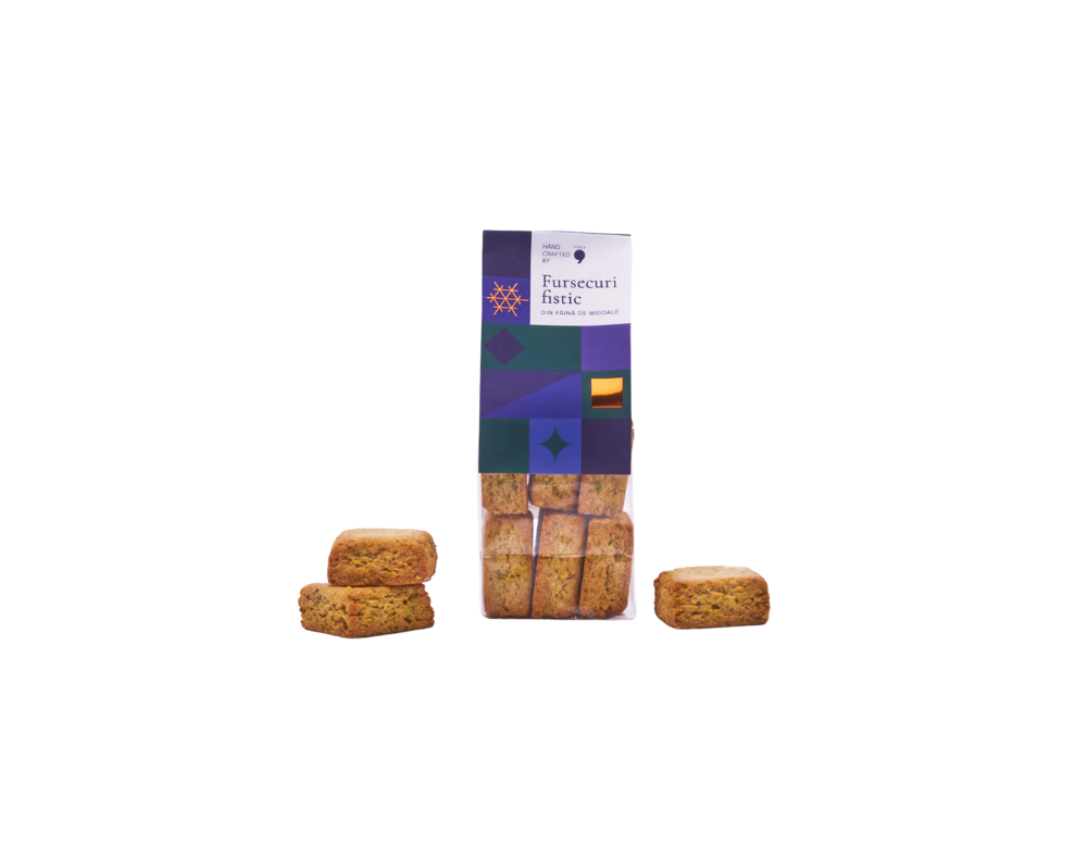 Fursecuri cu fistic, de la Piața9. Coapte artizanal la Oradea din făînă de migdale, făînă de fistic și aromatizate cu miere și apă de trandafir. Rezultă un fursec cu textură de marzipan, gumos și sfărâmicios, in care fisticul este cu adevărat vedetă. Produs in loturi mici din ingrediente premium și 100% naturale.